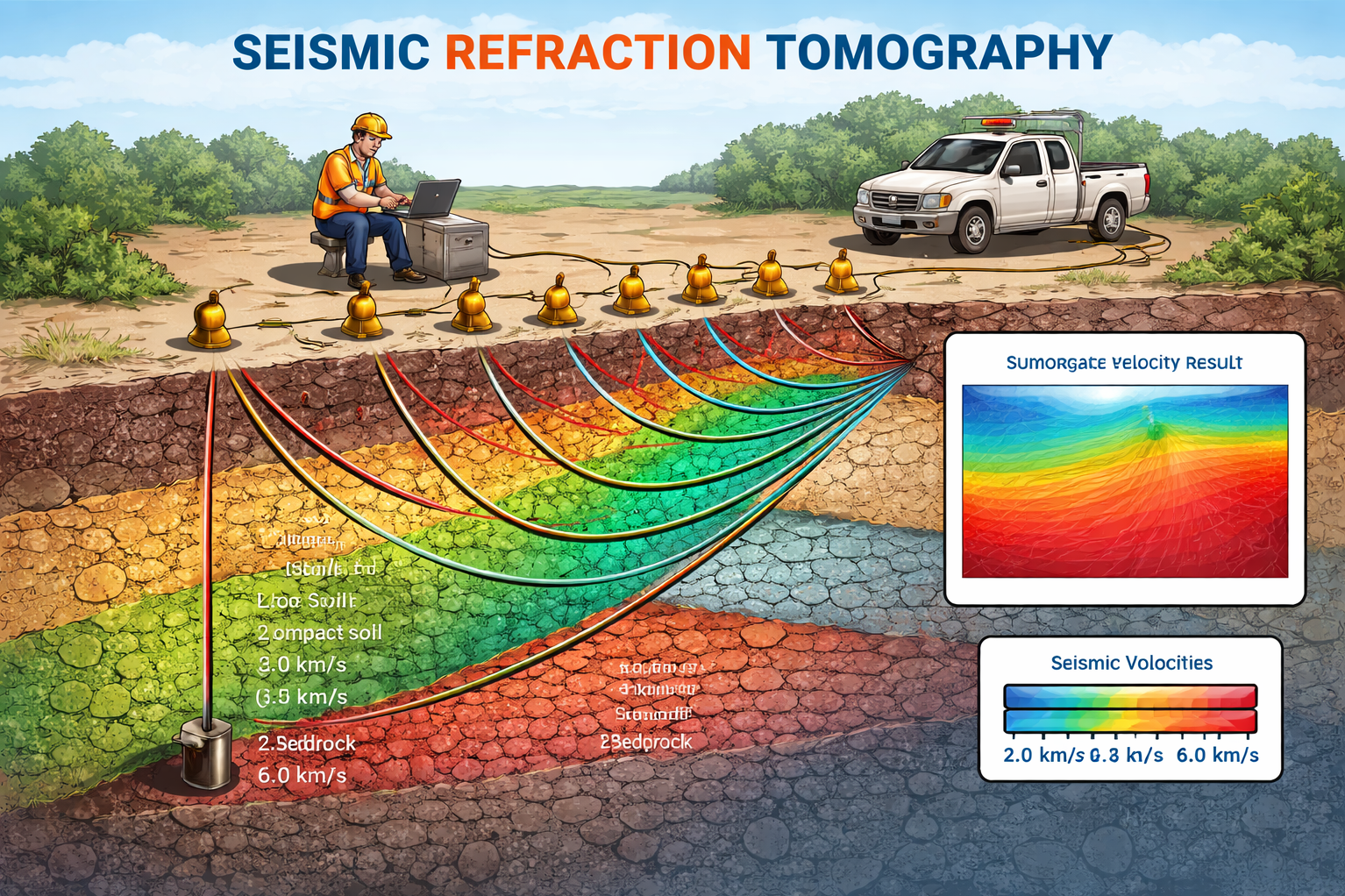 In construction, understanding the characteristics of the subsurface layers is key to building safely and effectively. Seismic Refraction Tomography is a non-invasive technique that uses seismic waves to map the subsurface structure, identifying soil types, rock formations, and any anomalies that may affect your project.